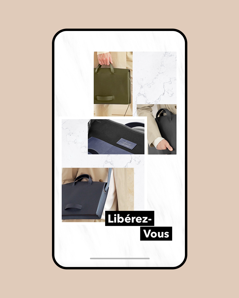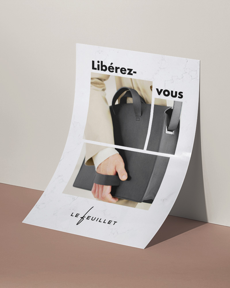 À l'occasion de la sortie de leur nouveau produit, le sac à bandoulière, Lefeuillet m'a chargé de créer une affiche afin de faire le faire découvrir. Cette affiche devait être déclinable en posts et story Instagram. Étant une marque qui se veut épurée et minimaliste, je suis parti vers un visuel très épuré, clair et élégant.